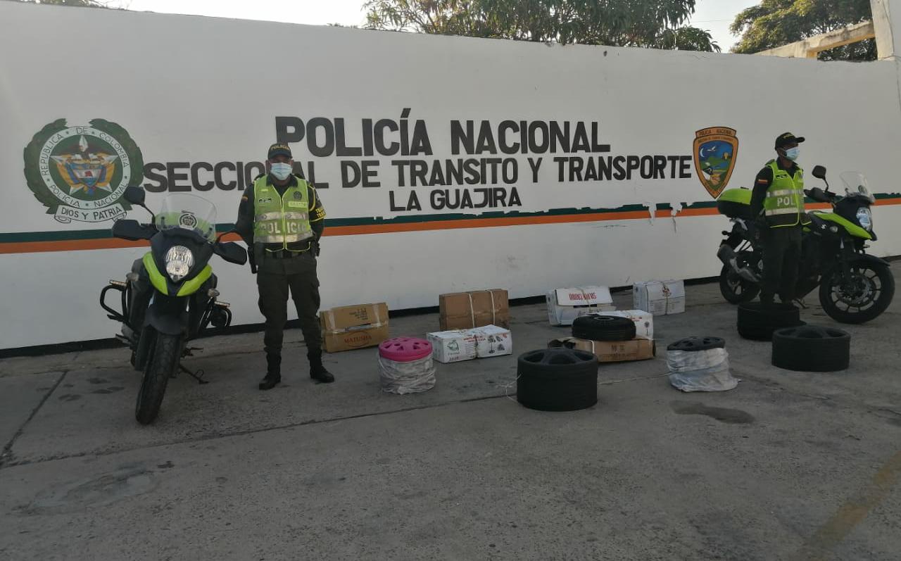 Riohacha, La Guajira. En el marco del Plan Choque ‘Construyendo Seguridad’, la Seccional de Tránsito y Transporte del Departamento de Policía Guajira, capturó a una persona por violar Medida de Detención Domiciliaria, e incautó mercancía de contrabando por valor de $9.000.000.