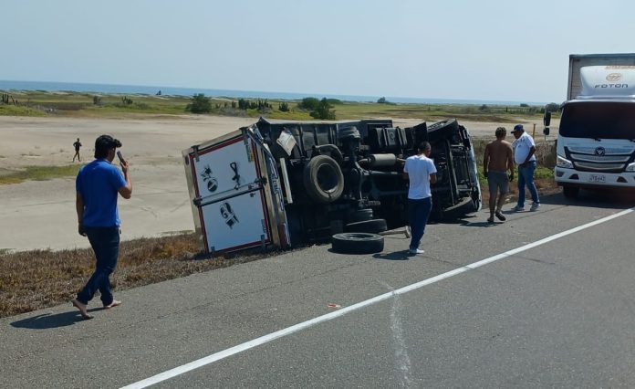 En el kilómetro 34 de la vía que de Barranquilla conduce a Ciénaga, un camión tipo turbo se volcó, aparentemente debido a un microsueño del conductor.
