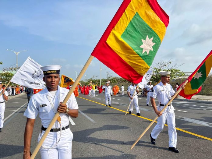 Los asistentes, entre los que se encontraban niños, asistieron vestidos con los colores representativos de la bandera de Barranquilla, mientras disfrutaban de la puesta en escena de la que hizo parte la Armada de Colombia, el Ejército Nacional y la Policía Metropolitana.