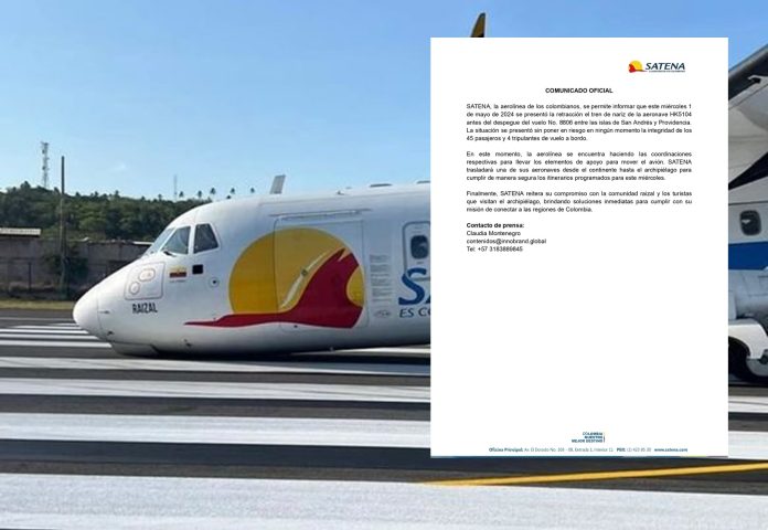 SATENA, la aerolínea de los colombianos, emitió un comunicado respecto al incidente ocurrido el miércoles 1 de mayo de 2024 en el Aeropuerto Gustavo Rojas Pinilla de San Andrés, relacionado con la retracción del tren de nariz de la aeronave HK5104 antes del despegue del vuelo No. 8806 con destino al municipio de Providencia.