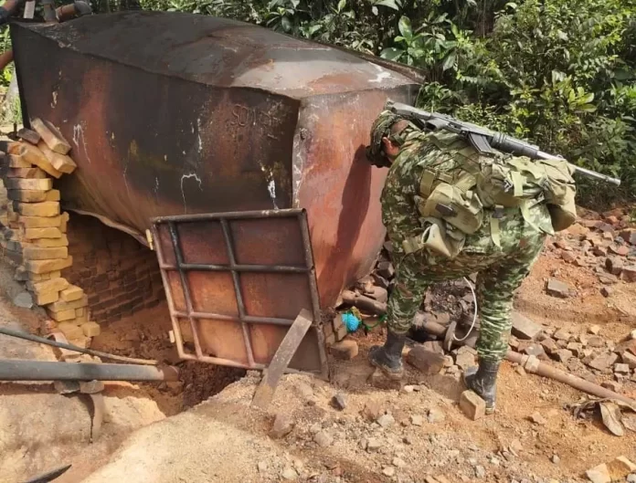 En las últimas horas, en un trabajo articulado entre el Ejército Nacional, la Fuerza Aérea y la Fiscalía General de la Nación, se lograron ubicar e inhabilitar siete refinerías ilegales con más de 670.000 galones de crudo hurtado en la zona rural del municipio de Tibú, Norte de Santander.