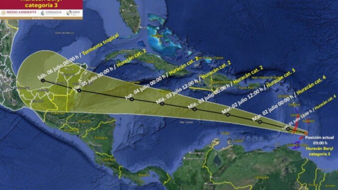 Se espera un debilitamiento adicional a partir de entonces, aunque se pronostica que Beryl seguirá siendo un huracán hasta que toque tierra en la península de Yucatán.