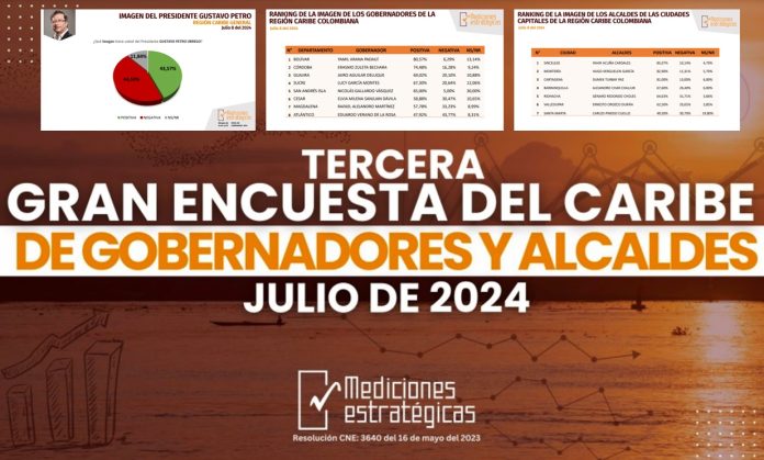 De manera paralela, la encuesta también analizó la opinión pública respecto a los gobernadores de los departamentos del Caribe: Atlántico, Bolívar, Magdalena, Cesar, La Guajira, Córdoba, Sucre y el Archipiélago de San Andrés, Providencia y Santa Catalina. Se destacaron las percepciones sobre su imagen y la aprobación de su desempeño hasta el momento.