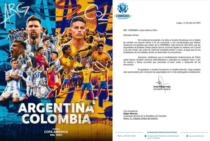 La CONMEBOL notificó a la representación diplomática de Bogotá en Miami la medianoche del viernes sobre posibles acciones penales en territorio estadounidense contra ciudadanos colombianos involucrados en actos violentos durante el partido final de la Copa América 2024 contra Argentina, programado para el domingo.