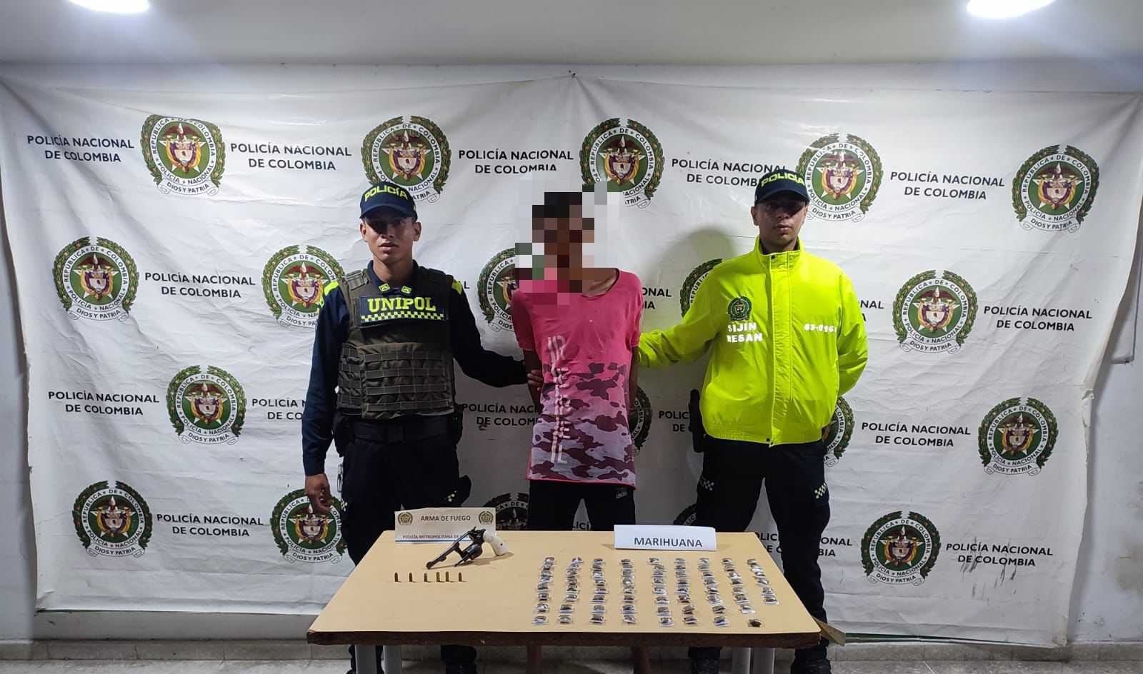 El capturado fue identificado como Emilson Castro, quien fue sorprendido durante un operativo de registro a personas, donde se le halló en su poder un revólver calibre 32 con 6 cartuchos y 100 gramos de marihuana distribuidos en dosis. Según las investigaciones realizadas por el personal de Investigación Criminal obtenidas mediante fuente humana indicarían que el capturado presuntamente estaría vinculado al grupo organizado Clan del Golfo, desempeñando funciones como distribuidor de estupefacientes en dicha área.