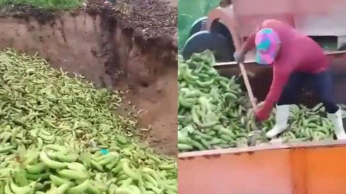 En las imágenes, se observa cómo los guineos son arrojados a una fosa para ser enterrados, lo que ha generado malestar entre los residentes. Argumentan que, a pesar de que el guineo tiene un precio alto en los mercados locales, la región, conocida por su producción bananera, está desperdiciando grandes cantidades del fruto.