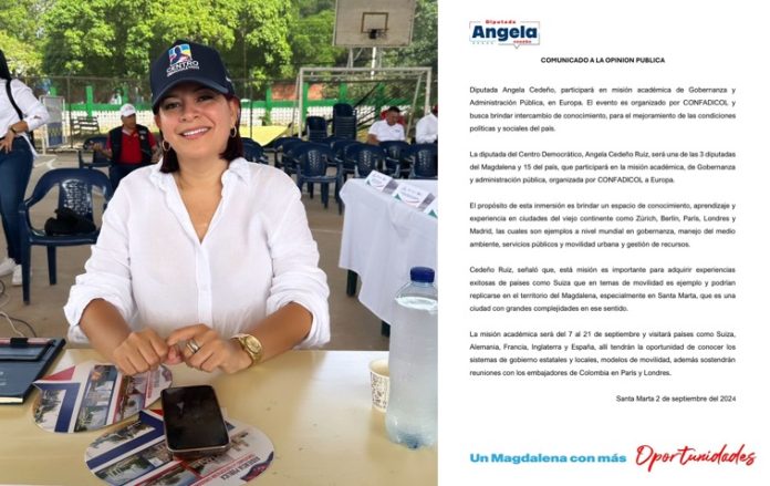 La diputada Ángela Cedeño Ruiz, del Centro Democrático, representará al Magdalena en una misión académica de gobernanza y administración pública organizada por Confadicol.