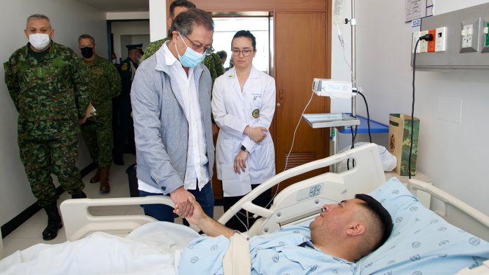El presidente Gustavo Petro visitó este miércoles en el hospital Militar de Bogotá a los soldados del Ejército Nacional heridos tras el ataque del ELN a la base militar de Puerto Jordán en el departamento de Arauca.