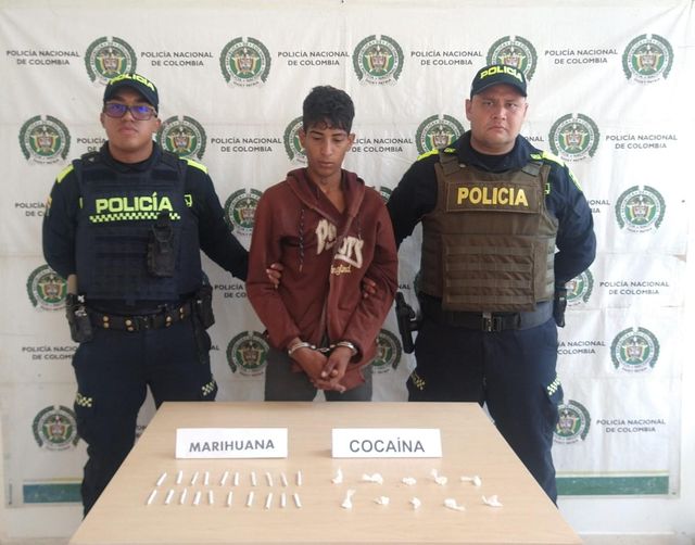 Durante un patrullaje de rutina en la calle 4 con carrera 13, los policías observaron a un hombre, quien vestía un buzo marrón y pantalón negro, en actitud sospechosa. Tras solicitarle que permitiera un registro personal, los uniformados encontraron en su bolsillo 10 bolsas con clorhidrato de cocaína. Además, se le hallaron 20 cigarrillos artesanales de marihuana, con un peso de 20 gramos.