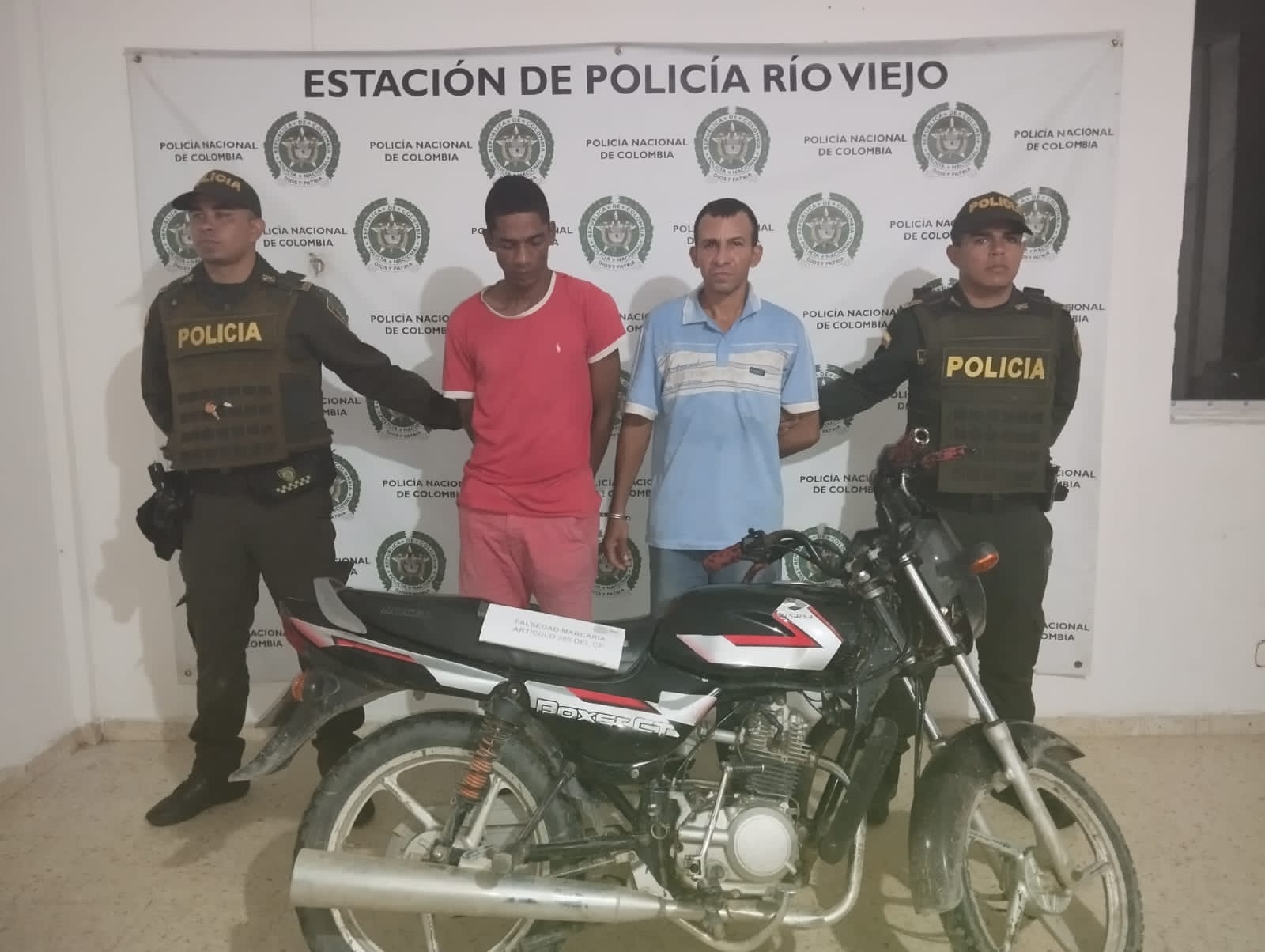 La Policía Nacional en Bolívar a través de sus patrullas de vigilancia en el municipio de Río Viejo, capturaron a dos presuntos delincuentes quienes se movilizaban en una motocicleta sin placa. La pericia de los uniformados fue crucial para llegar a dónde estos dos sujetos, quienes al ver la presencia de la patrulla emprenden la huida.