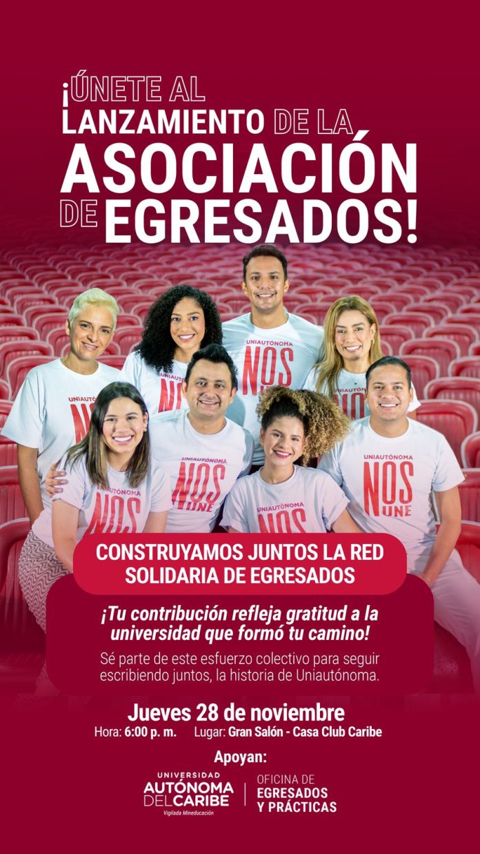 La Universidad Autónoma del Caribe extiende una invitación especial a toda su comunidad para participar en la consolidación de la Asociación de Egresados, un proyecto liderado desde la rectoría con el objetivo de fortalecer los lazos entre egresados, estudiantes, funcionarios y padres de familia, y de promover el apoyo social y educativo en beneficio de jóvenes talentosos con recursos limitados.