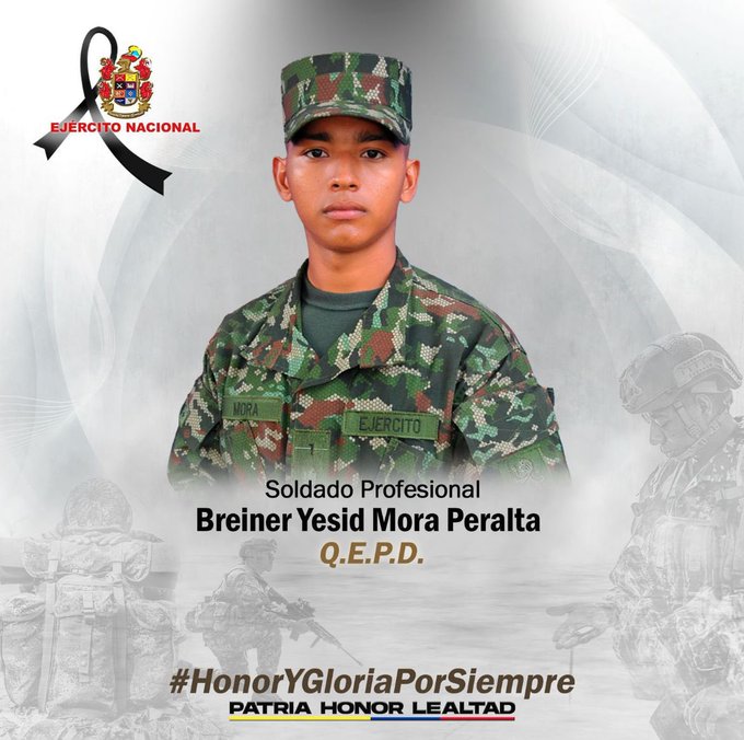 Al respecto, el Ejército Nacional de Colombia escribió; «#HonorYGloriaPorSiempre a nuestro soldado Breiner Yesid Mora Peralta, asesinado por integrantes de la Estructura Teófilo Forero, de la Segunda Marquetalia, mientras adelantaba operaciones para salvaguardar la vida de las comunidades del municipio de Palestina, en el sur del #Huila.