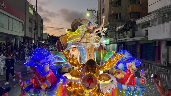 La reina del carnaval, Tatiana Angulo Fernández de Castro, deslumbró a los presentes con su obra «El Canto del Copo de Nieve», que culminó su recorrido en las inmediaciones del Teatro Amira de la Rosa.