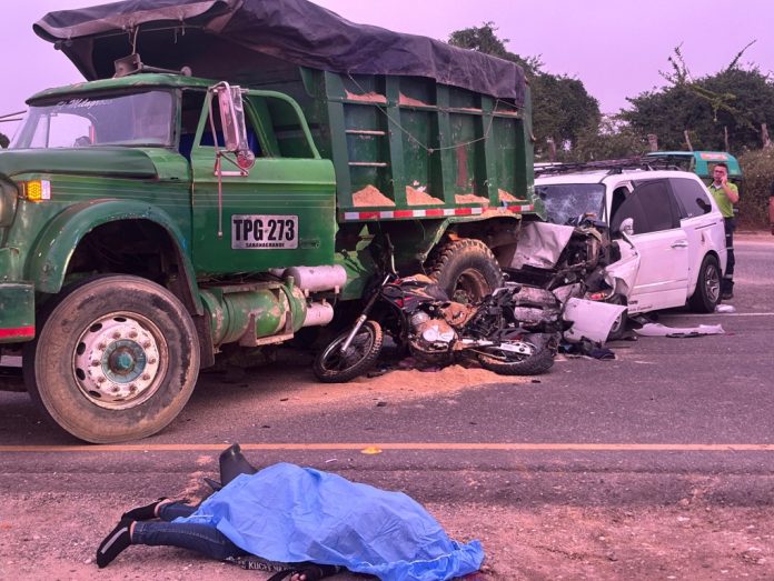 De acuerdo con las autoridades, la volqueta hizo un cruce inesperado, lo que provocó que la camioneta y la motocicleta impactaran contra el vehículo pesado.