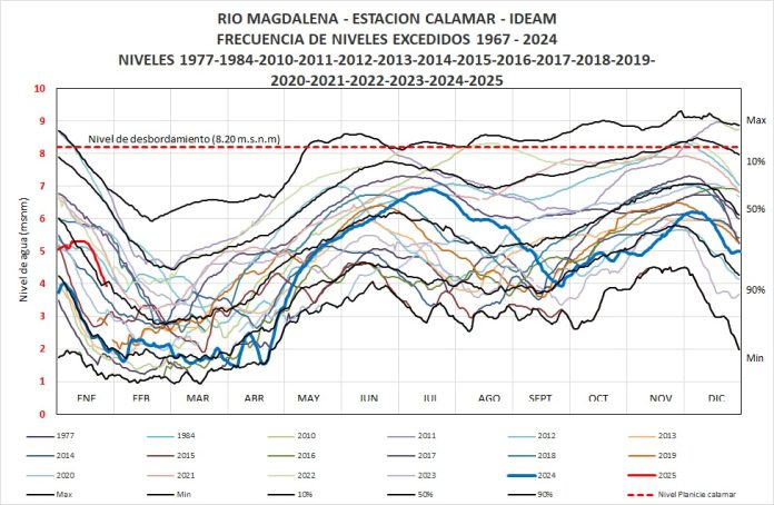 Sin embargo, los registros diarios de los niveles del río Magdalena han mostrado una disminución rápida en la región, lo que confirma que las afectaciones no dependen únicamente de las condiciones actuales de La Niña, sino también de otros factores climáticos y el ciclo estacional característico de la época del año.