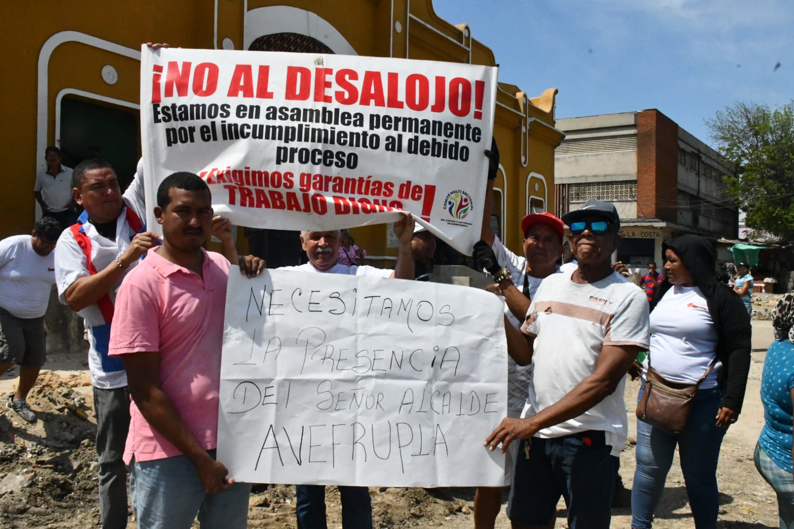 Un grupo de vendedores del Mercado de Granos en Barranquilla, ubicado en la Plazoleta Águila, se manifestaron este miércoles en un plantón exigiendo garantías para continuar con su actividad comercial. Los manifestantes, liderados por Celio Arias Ortega, vocero de los vendedores y trabajador en el sector de frutas, denuncian el desalojo que están enfrentando debido a las obras de rehabilitación impulsadas por la administración del alcalde Alejandro Char.