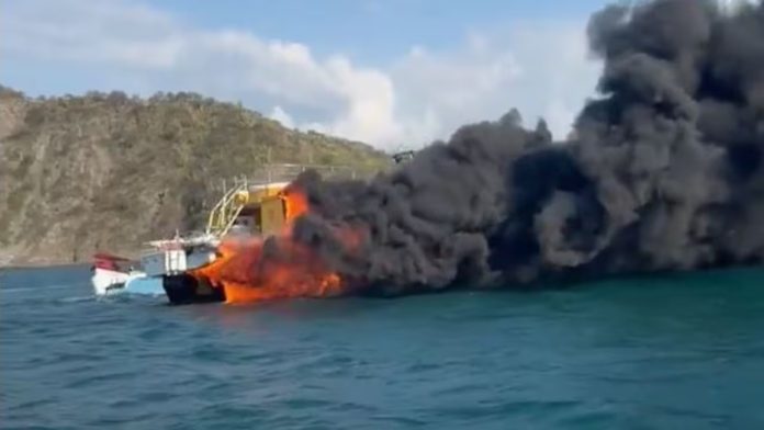 La embarcación ‘Katamaran Tayrona I’, adscrita a la empresa turística Taxi Marino, fue consumida por las llamas mientras se desplazaba en el mar.