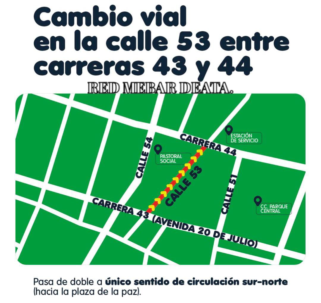 A partir de este jueves 3 de abril, se implementará un cambio de sentido vial en un tramo de la calle 53 en la ciudad. La sección comprendida entre las carreras 43 y 44 pasará de doble sentido a un único sentido de circulación sur-norte, es decir, hacia la Plaza de la Paz.