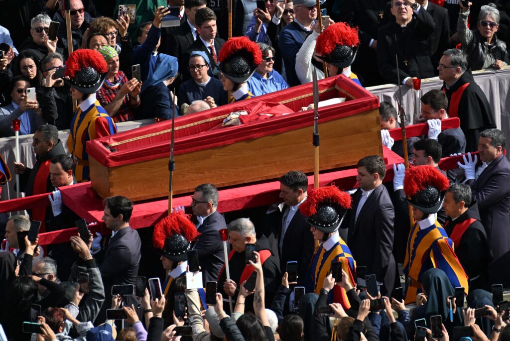 Desde allí, el Colegio Cardenalicio —vestido con los tonos austeros del luto papal— encabezó la procesión que cruzó la Plaza de Santa Marta y pasó bajo el Arco de las Campanas. En su avance lento y reverente, llevaron el féretro hacia la Plaza de San Pedro, donde ya se congregaban más de 20.000 personas.