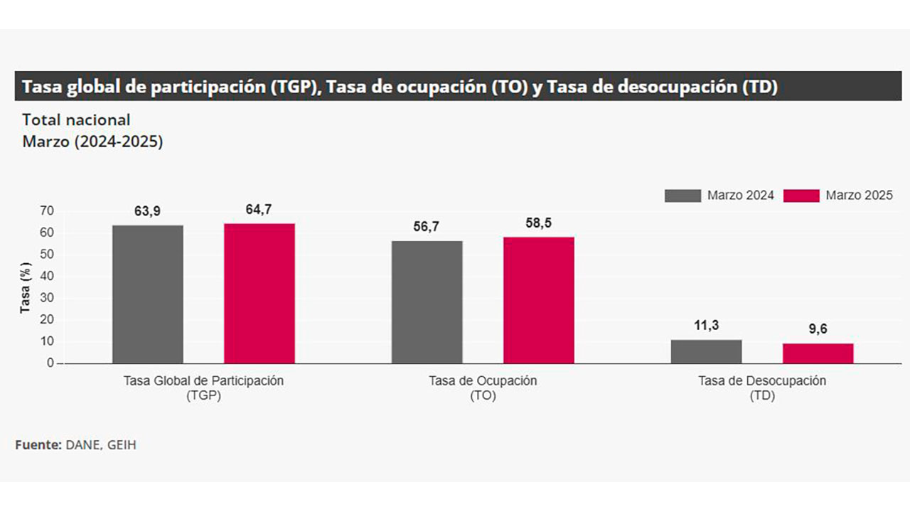 El desempleo en marzo de 2025 disminuyó 1,7 puntos porcentuales frente al mismo mes del año pasado y se ubicó en 9,6 % desde el 11,3 % de 2023. Esto significa una variación absoluta de 1’057.000 personas ocupadas, reveló el Departamento Administrativo Nacional de Estadísticas – DANE.