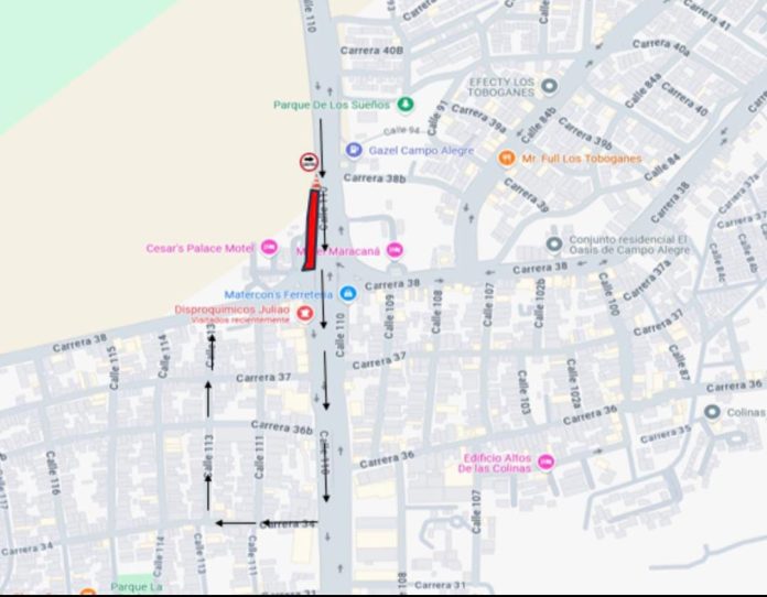 Opción 1: Los conductores que transiten por la Circunvalar deberán tomar el puente en sentido sur, ingresar al carril occidental, girar a la derecha por la carrera 34 o 31 y luego retomar por la calle 113 hacia la vía a Juan Mina.