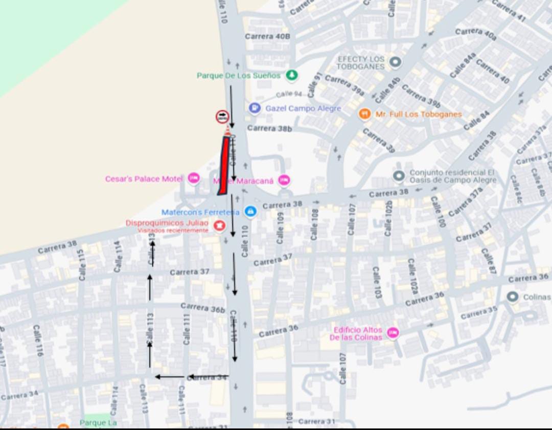 Opción 2: Otra alternativa para quienes se movilicen hacia el sur es tomar la carrera 38 hasta la calle 111, girar a la izquierda por la carrera 37 y reincorporarse a la avenida Circunvalar.