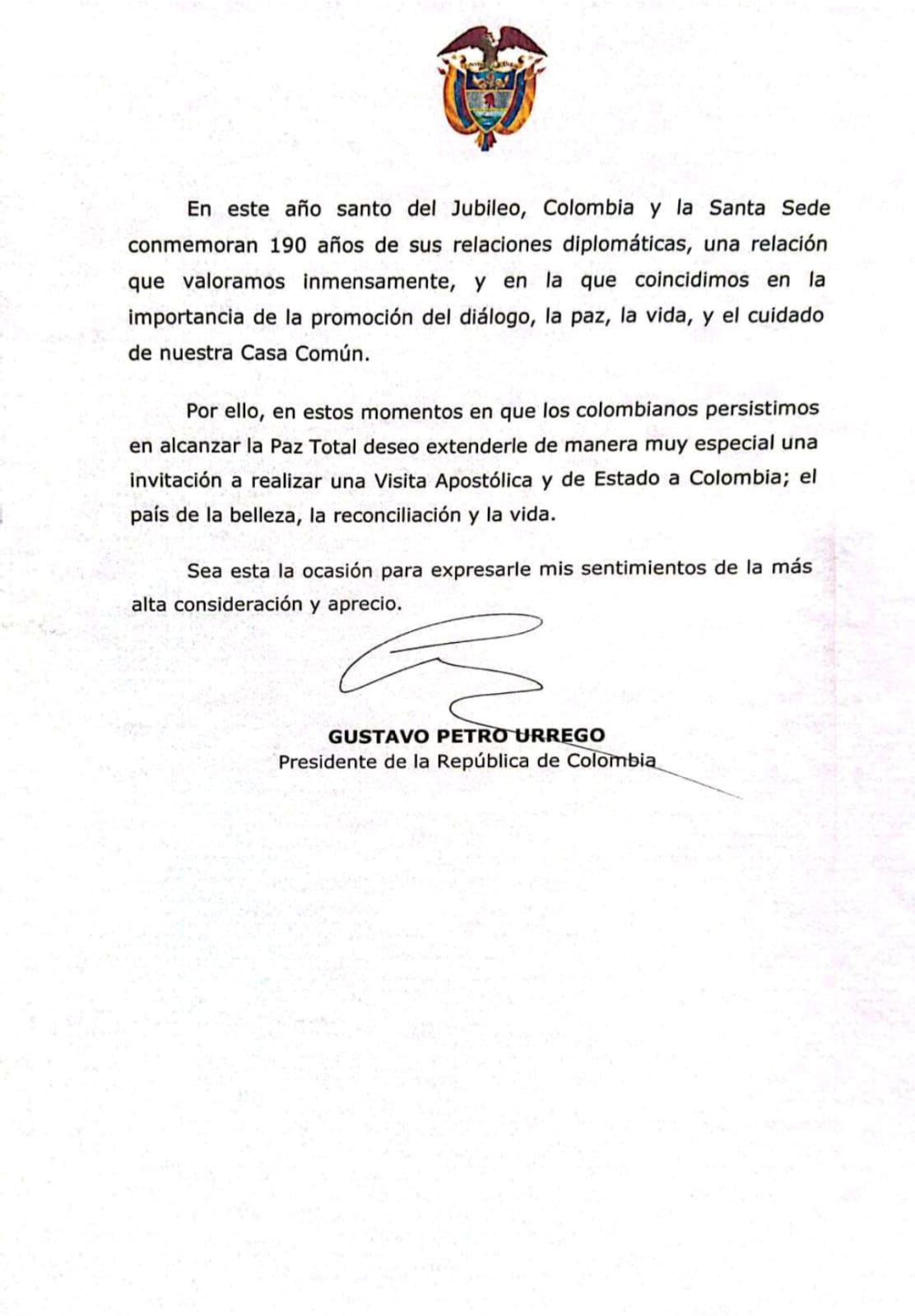 Uno de los momentos centrales del encuentro fue la entrega de una carta por parte del mandatario colombiano al nuevo Sumo Pontífice, en la que expresa su deseo de que el Papa realice una Visita Apostólica y de Estado a Colombia. La propuesta está enmarcada en el contexto del año santo del Jubileo y del camino que el país suramericano ha emprendido hacia la Paz Total.