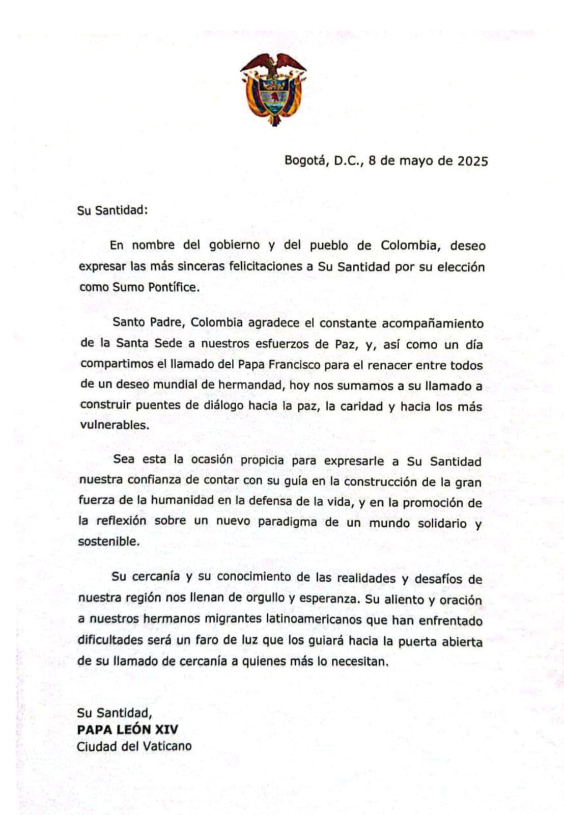 En la carta dirigida al papa León XIV, el presidente Petro destacó la histórica relación entre Colombia y el Vaticano, y agradeció “el constante acompañamiento de la Santa Sede a nuestros esfuerzos de paz”, evocando también la inspiración que significaron las palabras del papa Francisco sobre la hermandad mundial y el diálogo.