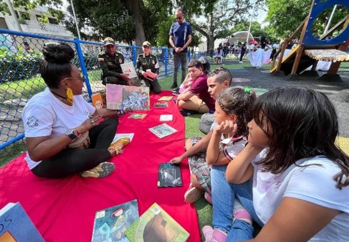 La biblioteca también lleva sus programas a los Hogares Comunitarios con la ayuda del ICBF y la Policía Nacional, donde los niños expresan sus emociones y aprenden valores a través de cuentos.