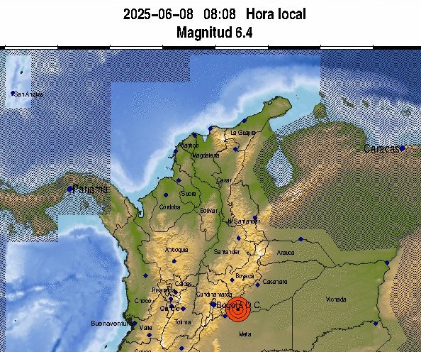 #SismosColombiaSGC Evento Sísmico – Boletín Preliminar, 2025-06-08, 08:08 hora local. Magnitud 6.4. #NoticiaEnDesarrollo #Temblor #Sismo ¿Sintió este sismo? repórtelo https://t.co/pgC7OC2O7j Más información: https://t.co/h4VVP0556L pic.twitter.com/DSPzbdOgmI