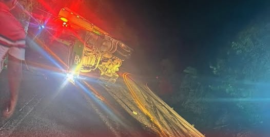 Una mula de placas SOP-822 se salió de la carretera y terminó completamente volcada a un costado. Según versiones, el conductor se habría quedado dormido mientras manejaba.