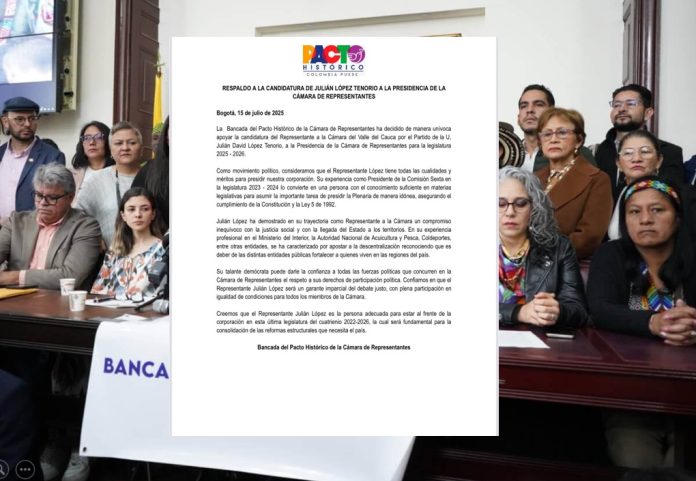 El Pacto Histórico anunció hoy su respaldo oficial a Julián López, actual Representante a la Cámara por el departamento del Valle del Cauca y miembro del Partido de la U, como su candidato a la Presidencia de la Cámara de Representantes.