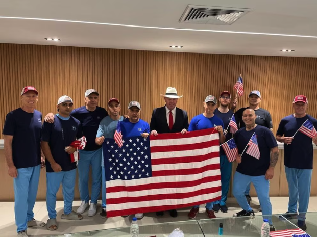 La Oficina Externa de EE.UU. para Venezuela compartió una fotografía de los liberados y escribió: “Nada representa la libertad como la bandera de los Estados Unidos. Diez estadounidenses liberados de prisiones venezolanas hoy están regresando a casa gracias al presidente Donald Trump, al secretario de Estado Marco Rubio y al presidente Nayib Bukele. América Primero en acción”.