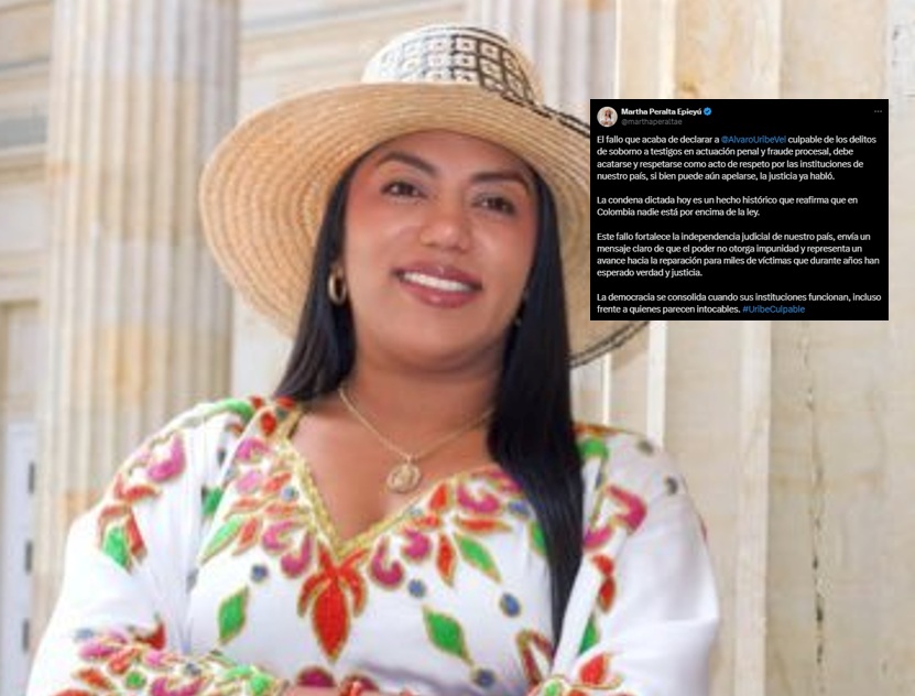 La senadora Martha Peralta, del Pacto Histórico, se pronunció este lunes a través de sus redes sociales sobre el fallo que declara culpable al expresidente Álvaro Uribe Vélez por los delitos de soborno a testigos en actuación penal y fraude procesal.