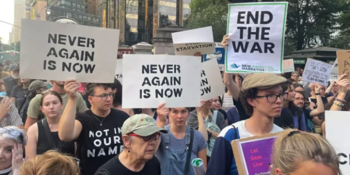 Cientos de manifestantes se reunieron en Columbus Circle, Nueva York, frente al Trump International Hotel, para participar en una protesta liderada por organizaciones judías de izquierda. Bajo el lema “Los judíos dicen: no más”, los asistentes exigieron el fin inmediato de la guerra en Gaza, denunciaron las acciones del Estado de Israel y clamaron por la entrada urgente de ayuda humanitaria.