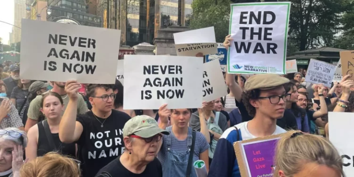 Desde Columbus Circle, frente al Trump International Hotel, organizaciones judías progresistas lideraron una masiva protesta bajo el lema “Los judíos dicen: no más”, en rechazo a la ofensiva militar israelí en Gaza y el bloqueo a la ayuda humanitaria.