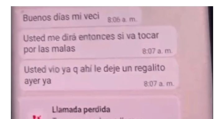 Uno de los mensajes interceptados por las autoridades decía: “Usted me dirá entonces si va a tocar por las malas, usted vio ya que ahí le dejé un regalito ayer”. En un video, se ve a uno de los delincuentes llegar en bicicleta hasta un establecimiento comercial y dejar un objeto intimidante como señal de amenaza.