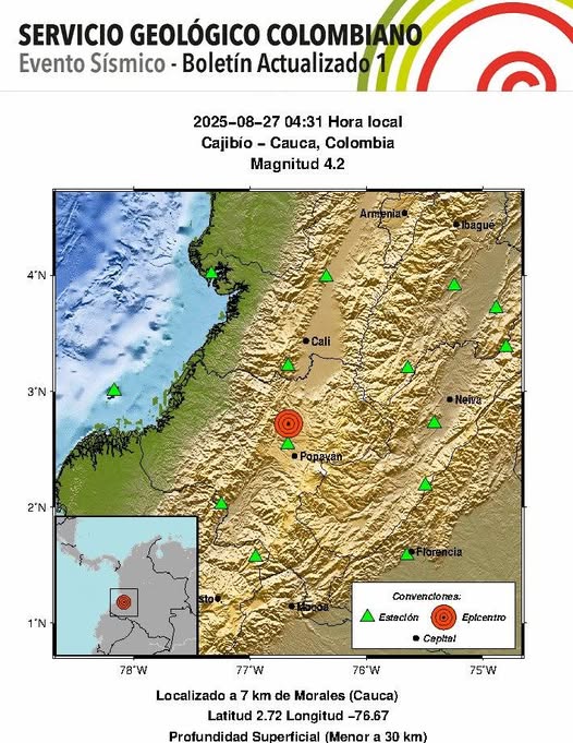 En la madrugada de este miércoles 27 de agosto, un sismo de magnitud 4.2 se registró en el municipio de Cajibío, departamento del Cauca, según el primer boletín actualizado emitido por el Servicio Geológico Colombiano.