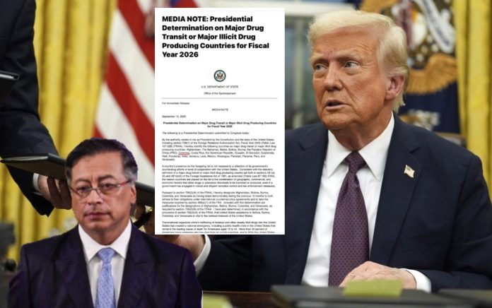El Gobierno de Estados Unidos, a través del Departamento de Estado, hizo pública este lunes 15 de septiembre de 2025 la decisión de descertificar a Colombia en su lucha contra las drogas, tal como había anticipado el presidente Gustavo Petro.