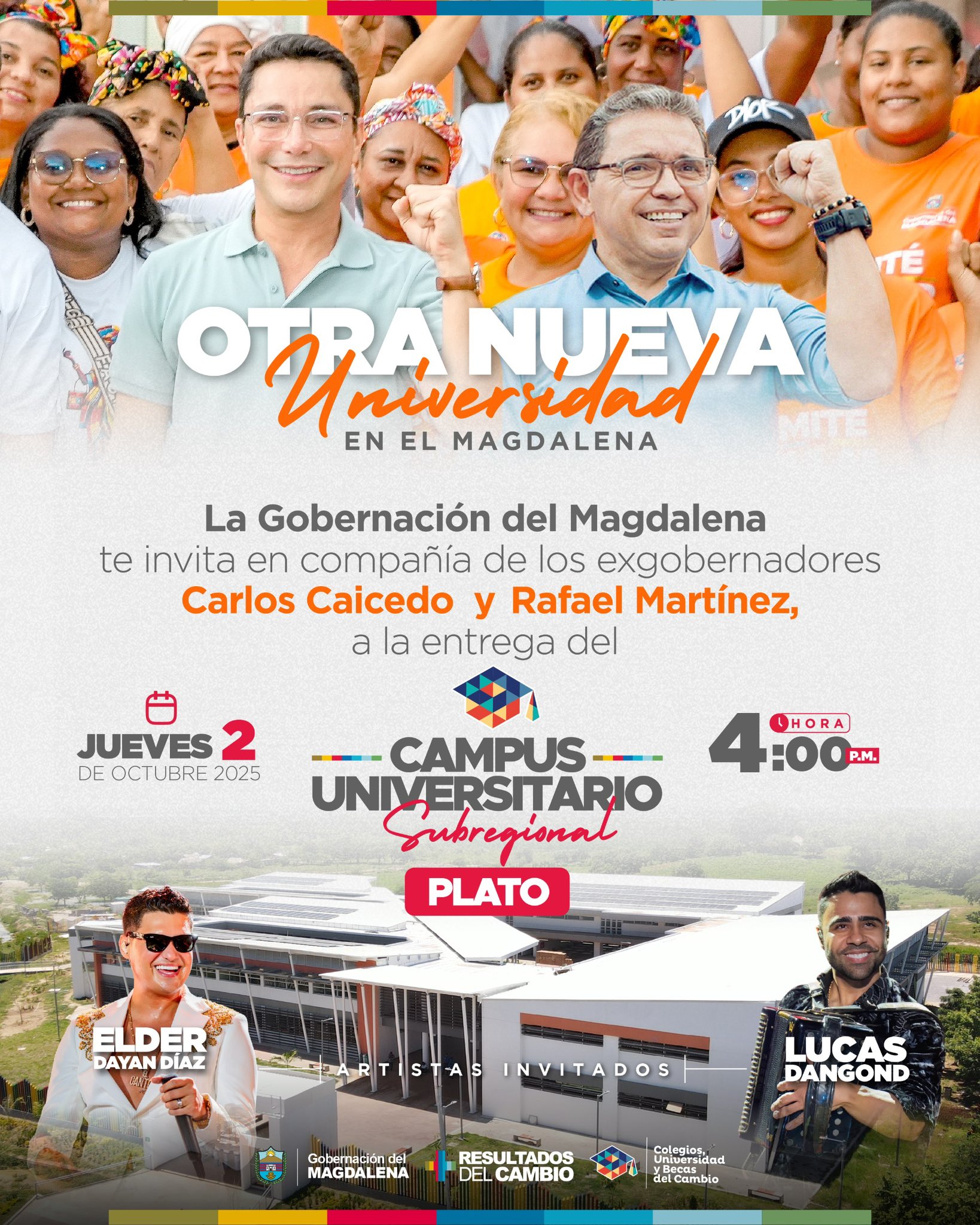 La Gobernación del Magdalena anunció la entrega del Campus Universitario Subregional de Plato, un proyecto que busca ampliar el acceso a la educación superior en el departamento y que será inaugurado con un acto cultural y musical.