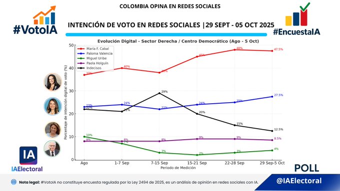 La más reciente Medición Digital de la Derecha realizada entre el 29 de septiembre y el 5 de octubre revela un escenario de consolidación y ajustes internos en el bloque uribista. Aunque María Fernanda Cabal se mantiene como la figura dominante en el entorno digital con un 47.5 %, su leve descenso coincide con el ascenso de Paloma Valencia, quien gana terreno y se consolida como la segunda fuerza más sólida del sector.