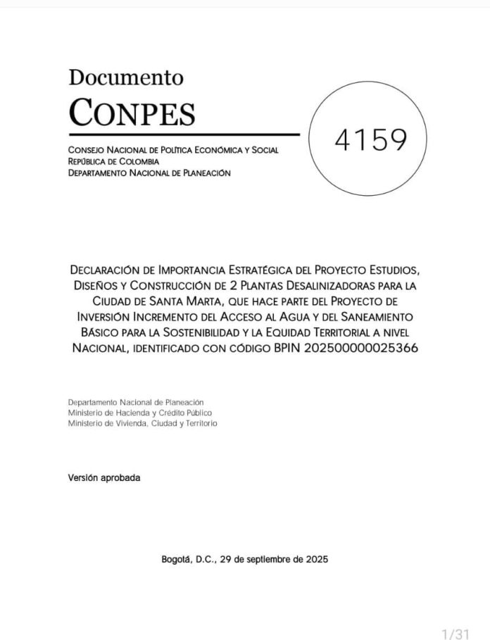 El Consejo Nacional de Política Económica y Social (CONPES) aprobó el documento 4159, que declara de importancia estratégica el proyecto de estudios, diseño y construcción de dos plantas desalinizadoras para la ciudad de Santa Marta, una iniciativa clave para garantizar el acceso sostenible al agua potable en la capital del Magdalena.