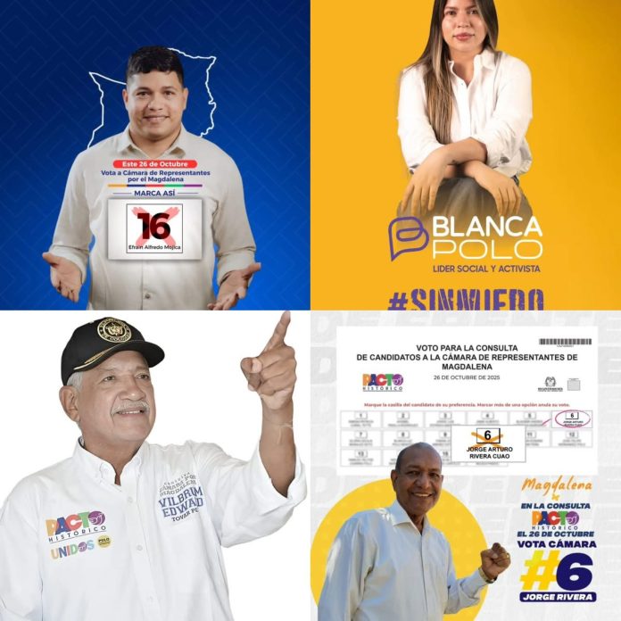 Entre los aspirantes más destacados figuran Efraín Mojica, un reconocido líder social y comunitario con años de trabajo en diversas localidades del Magdalena; Blanca Polo, activista comprometida con la defensa de los derechos de las mujeres y comunidades vulnerables; Vilbrum Tovar, un dirigente con una extensa trayectoria en procesos políticos locales; y Jorge Rivera, quien representa la renovación y la juventud dentro del movimiento.