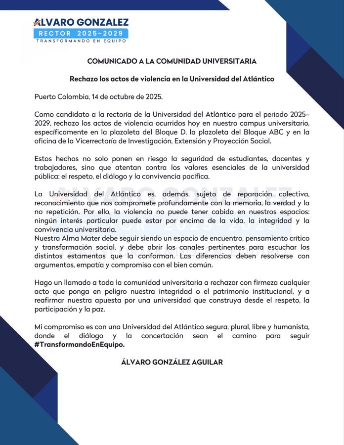 El candidato a la rectoría de la Universidad del Atlántico para el periodo 2025–2029, Álvaro González Aguilar, expresó su rechazo ante los actos de violencia registrados este 14 de octubre en las plazoletas de los bloques D y ABC del campus universitario, así como en la oficina de la Vicerrectoría de Investigación, Extensión y Proyección Social.
