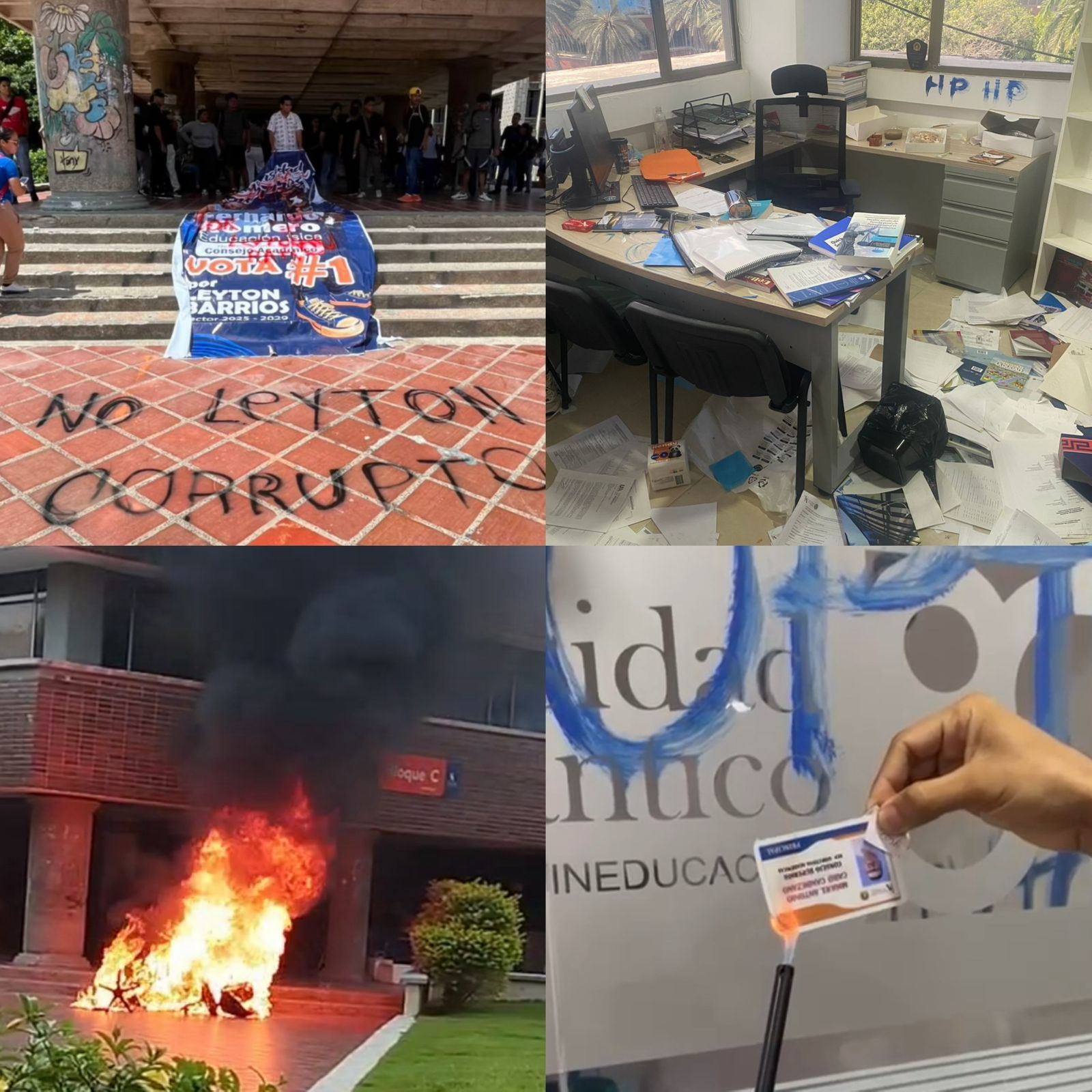 Asimismo, señalaron a varios consejeros de mostrar afinidad con el candidato, entre ellos a Miguel Caro, actual representante de las directivas académicas, cuya oficina fue tomada y vandalizada con grafitis donde lo tildaron de “corrupto”. También mencionaron a Angelly Díaz Cordero, representante estudiantil, y a Abraham Scoll, representante de egresados, quienes según los manifestantes respaldan abiertamente a Barrios.