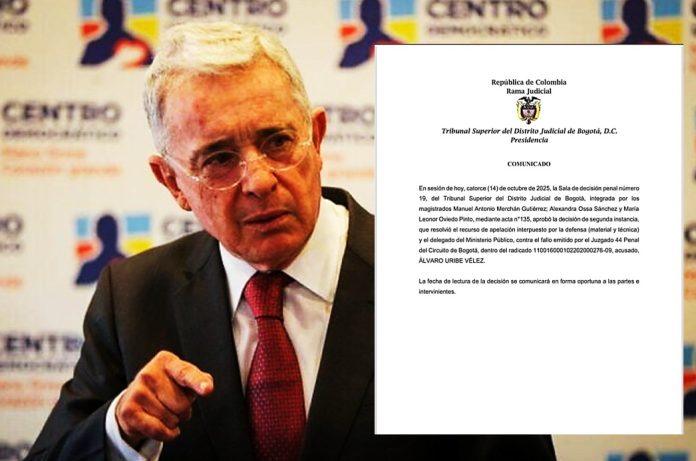 El Tribunal Superior de Bogotá anunció que el próximo martes 21 de octubre a las 8:00 a.m. se llevará a cabo la audiencia de lectura del fallo de segunda instancia en el proceso que enfrenta el expresidente Álvaro Uribe Vélez por los presuntos delitos de soborno en actuación penal y fraude procesal.