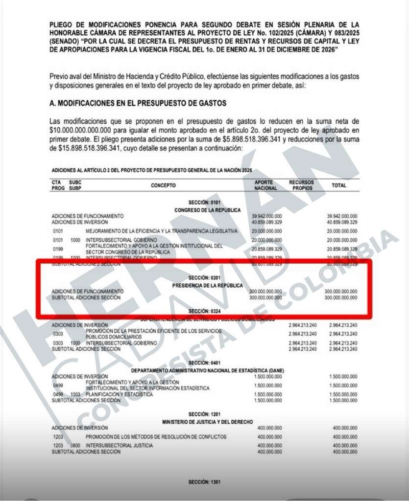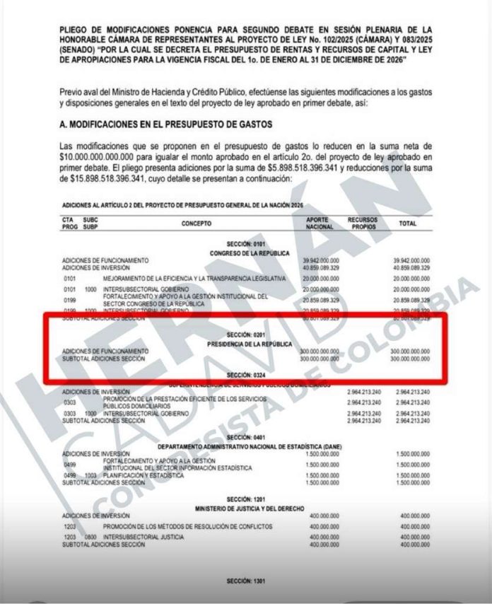 El proyecto de presupuesto del Gobierno Nacional para 2026, presentado por el presidente Gustavo Petro, contempla 300.000 millones de pesos destinados al funcionamiento del Departamento Administrativo de la Presidencia de la República (DAPRE).