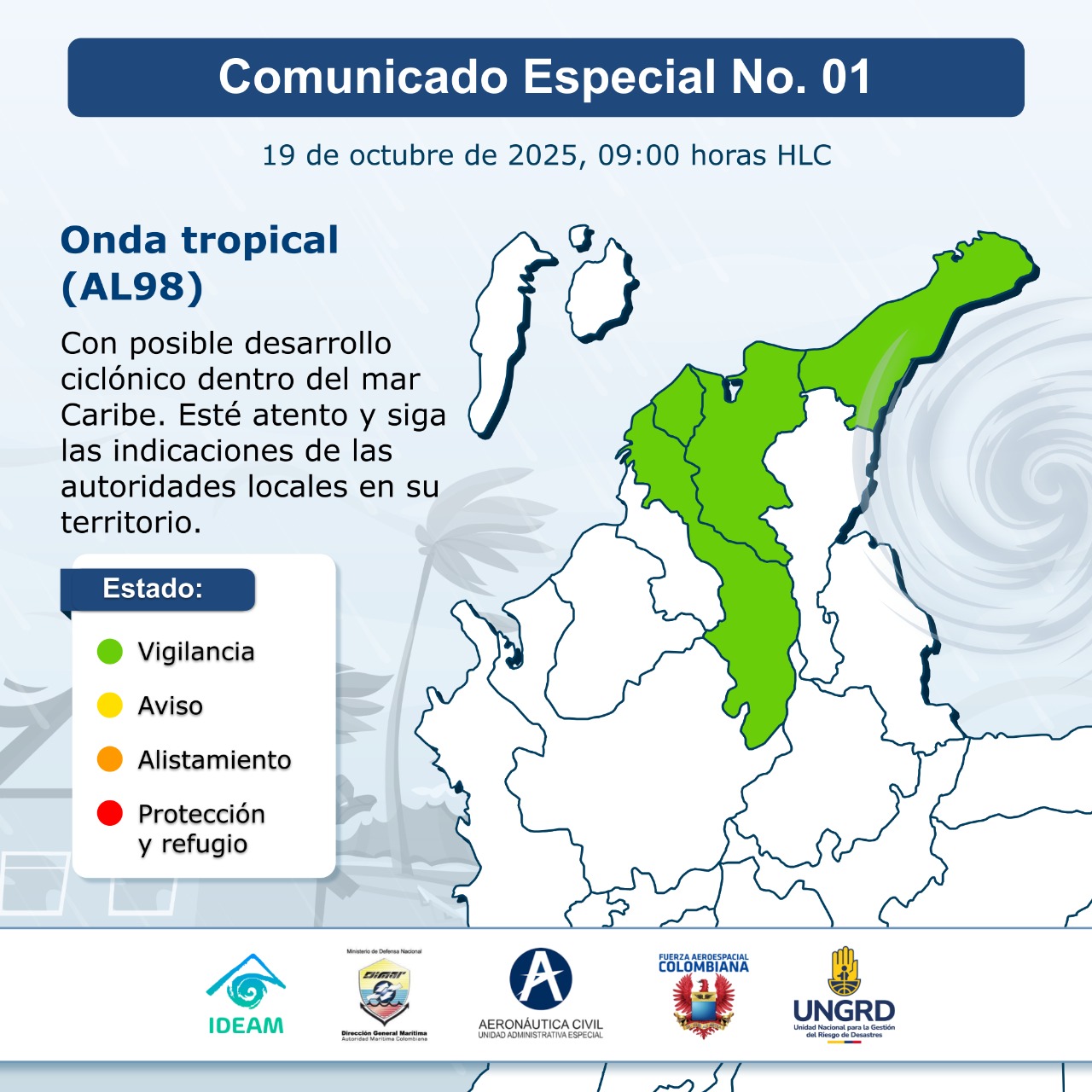 El Instituto de Hidrología, Meteorología y Estudios Ambientales (Ideam) emitió el Comunicado Especial No. 01 tras el monitoreo de una onda tropical identificada como AL98, actualmente ubicada al este de las Antillas y con desplazamiento hacia el mar Caribe.