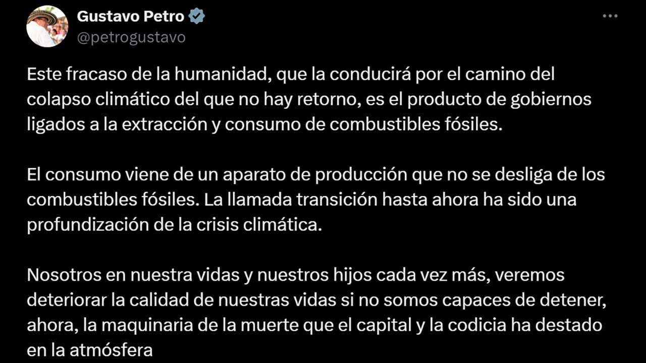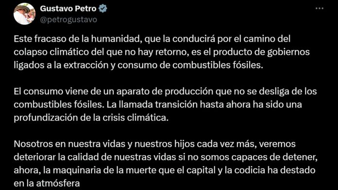 El mandatario advirtió este martes sobre la gravedad de la crisis climática que enfrenta el planeta y la responsabilidad de los gobiernos y sistemas económicos que continúan promoviendo la extracción y el consumo de combustibles fósiles. Su mensaje en X fue en respuesta al reciente pronunciamiento del secretario general de la ONU, António Guterres, quien reconoció que el mundo no alcanzará el objetivo de limitar el calentamiento global a 1,5 grados.