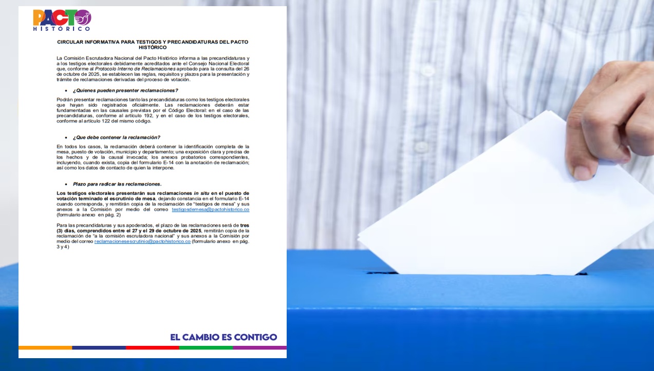 - Precandidaturas y apoderados: tendrán un plazo de tres días (27 al 29 de octubre de 2025) para radicar sus reclamaciones ante la Comisión Escrutadora Nacional, enviando los documentos al correo reclamacionesescrutinio@pactohistorico.co.